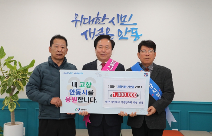 [뉴스노크=김인호 기자] 대구개인택시 안동향우회가 지난 28일 안동시청을 방문해 고향사랑기부금 100만 원을 기탁했다. 이번 기부는 2023년과 2024년에 이어 3년 연속 이어진 뜻깊은 나눔이다.