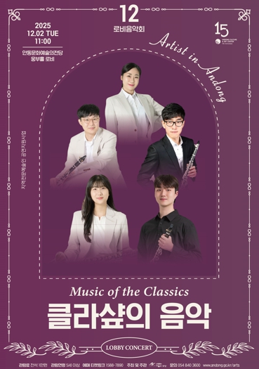 [뉴스노크=김인호 기자] 안동문화예술의전당은 지역예술인들에게 다양한 무대 경험을 제공하고, 시민에게는 일상 속 음악 향유할 수 있는 기회를 마련하고자, 매월 첫째 주 화요일 오전 11시에 로비음악회 시리즈를 진행하고 있다. 올해 마지막 로비음악회는 ‘클라샵’의 공연으로 12월 2일 오전 11시, 웅부홀 로비에서 '클라샾의 음악'이라는 제목으로 개최된다.
