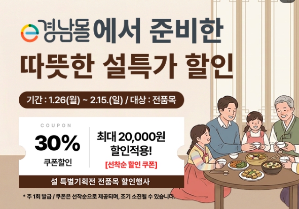 [뉴스노크=김인호 기자] 경상남도와 (재)경상남도투자경제진흥원이 운영하는 e경남몰은 1월 26일부터 예산 소진 시까지 ‘2026년 풍성한 설맞이 할인 기획전’을 진행한다.