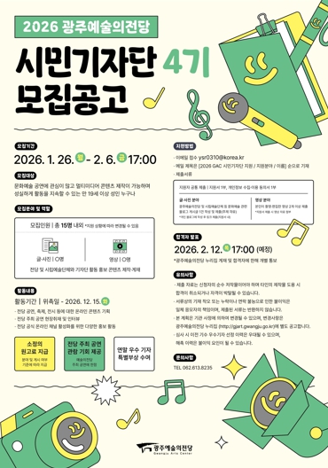[뉴스노크=김인호 기자] 광주광역시 예술의전당은 전당의 다양한 공연 정보와 문화 소식을 직접 취재하고 공식 온라인 채널을 통해 알릴 ‘2026 광주예술의전당 시민기자단 4기’를 26일부터 2월6일까지 모집한다.