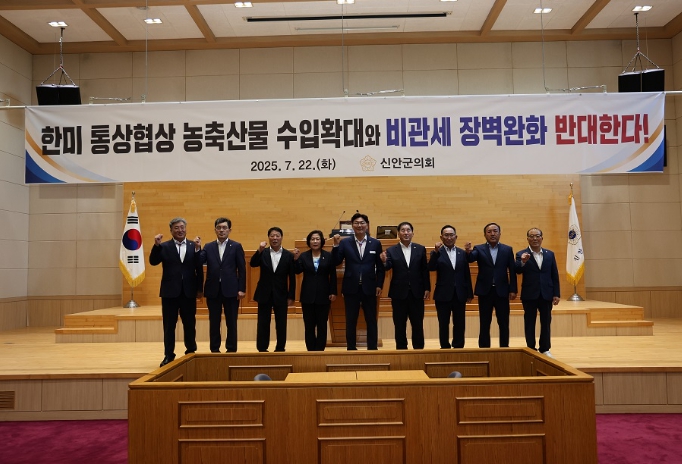 [뉴스노크=김인호 기자] 신안군의회가 정부의 대미 통상협상에서 농축산물 수입 확대 및 비관세 장벽 완화 가능성에 대해 강한 우려를 표하며 ‘전면 반대’ 성명을 발표했다.