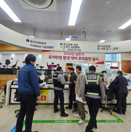 [뉴스노크=김인호 기자] 고성군은 1월 29일 군청 열린민원과에서 고성경찰서와 연계하여'2026년 상반기 특이민원 대응 모의훈련'을 실시했다.