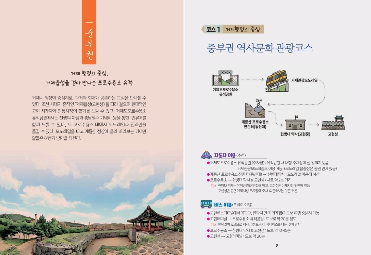 ‘관광코스’ 편에서는 거제를 권역별로 구분해 역사와 문화가 어우러진 관광 동선을 제안하고, 코스별 이동 경로와 주요 관광지에 대한 설명을 함께 담아 개별 여행객은 물론 가족 단위 관광객도 거제의 역사 관광을 효율적으로 즐길 수 있도록 했다.