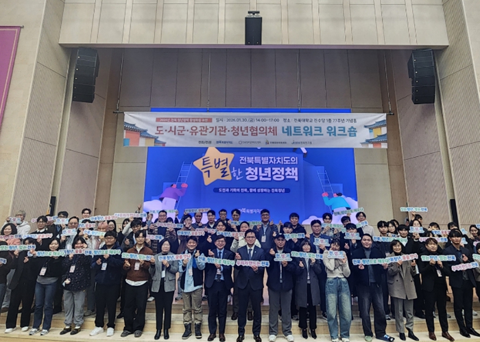전북자치도와 전북청년허브센터는 30일 전북대학교 진수당에서‘도·시군·유관기관·청년협의체 네트워크 워크숍’을 개최하고, 2026년 달라지는 청년정책의 현장 실행력 강화와 협력체계 구축 방안을 논의했다.