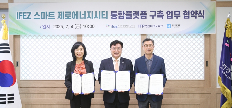 [뉴스노크=김인호 기자] 인천경제자유구역청(청장 윤원석)은 7월 4일 송도국제도시 G타워에서 인천테크노파크, 에너지사업자인 ㈜헤리트와 ‘IFEZ 스마트 제로에너지시티 통합플랫폼 구축’을 위한 업무협약을 체결했다고 밝혔다.