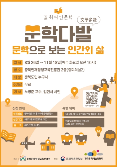 한편, 충북인평원은 문화체육관광부가 주최하고 한국문화예술위원회가 주관하는 ‘2025 길 위의 인문학’공모사업에 선정되어 국비 지원을 받아 이번 프로그램을 진행하게 됐다. 충북인평원 유태종 원장은 "이번 '문학다발' 프로그램이 바쁜 일상을 살아가는 도민들에게 문학을 통해 잠시 쉬어가며 자신의 삶을 성찰하는 귀한 기회가 되기를 바란다"며, "국비 지원을 통해 양질의 인문학 강좌를 제공하는 만큼 많은 분의 관심과 참여를 기대한다"고 밝혔다.