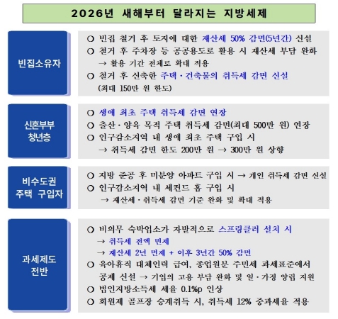 이번 개정은 △빈집 정비 △출산·양육 주택 취득 지원 △지역 균형발전 △공정 과세체계 구축에 중점을 두고 추진됐다.
