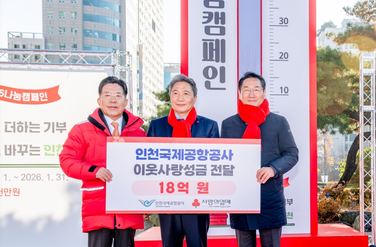 [뉴스노크=김인호 기자] 인천국제공항공사(사장 이학재)는 1일 오후 인천광역시청 앞 애뜰광장에서 진행된 ‘희망 2026 나눔 캠페인’출범식에 참여해 인천사회복지공동모금회(회장 조상범)에 지역 사회공헌 성금 18억 원을 전달했다고 밝혔다.