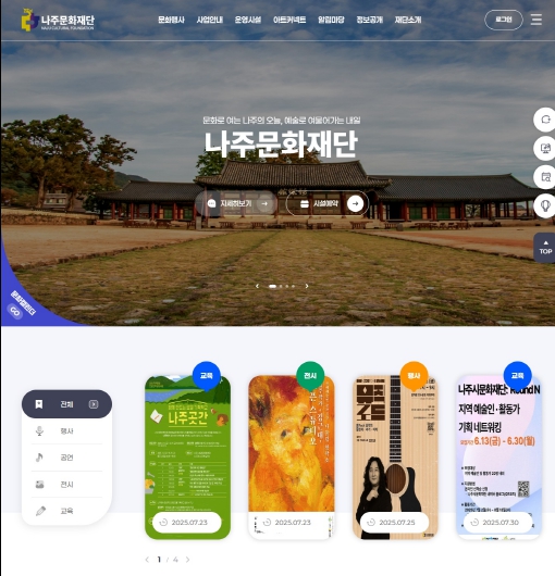나주문화재단(이사장 윤병태)은 공식 누리집을 개설하고 시민과 예술인을 위한 소통 창구이자 문화예술 정보의 중심 플랫폼으로 본격 운영을 시작했다고 24일 밝혔다.