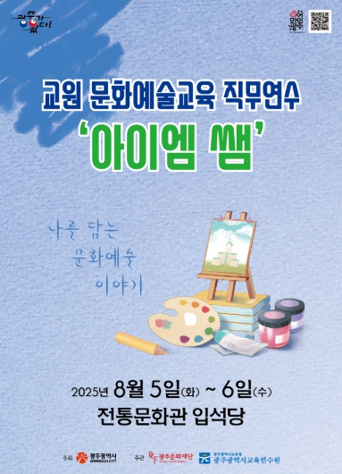 [뉴스노크=김인호 기자] 광주문화재단 문화예술교육지원센터는 오는 8월 5일부터 6일까지 전통문화관 입석당에서 ‘문화예술교육 연수 및 아카데미–서로배움’의 하나로 교원문화예술교육 직무연수 ‘아이엠 쌤’을 개최한다.