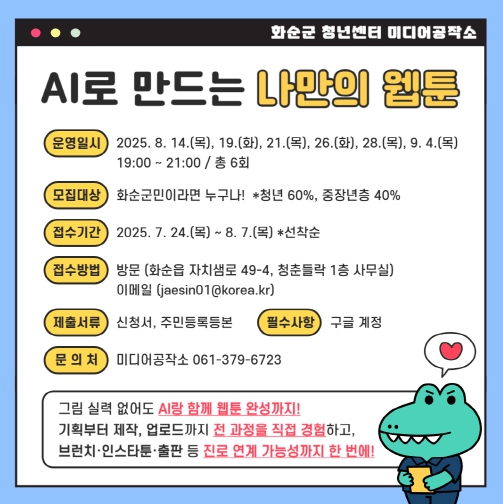 [뉴스노크=김인호 기자] 화순군(군수 구복규)은 오는 8월14일 저녁 7시 화순군 청년센터(청춘들락) 미디어공작소에서 화순군민을 대상으로 생성형 AI 기술을 활용한 웹툰 창작 교육을 진행한다고 밝혔다.