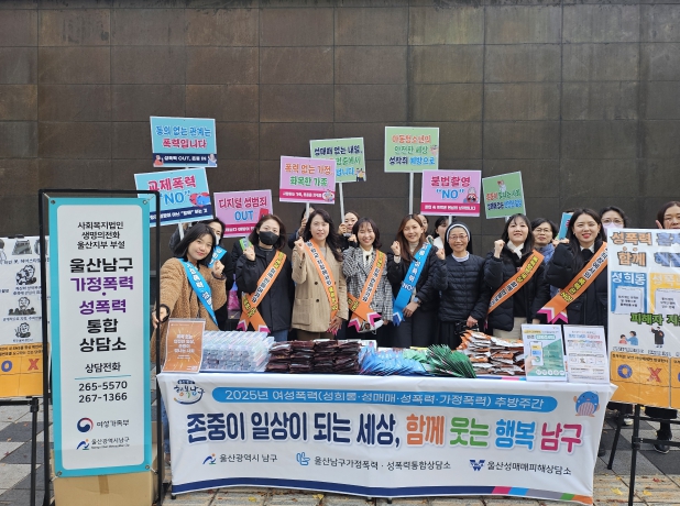 [뉴스노크=김인호 기자] 울산 남구는 ‘2025년 여성폭력 추방주간’을 맞아 27일 삼산 디자인거리 일대에서 울산성매매피해상담소와 울산남구가정폭력·성폭력통합상담소가 함께 ‘2025년 여성폭력 추방주간 캠페인’을 실시했다.