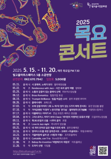 이번 공연은 ▲10회차 ‘드림피아노앙상블’의 클래식 '그리스로마人 이야기 With Classic '세이렌의 치명적인 유혹과 파멸'' ▲11회차 ‘포엠’의 실내악 연주 '목(木)요일의 선율:나무의 음악' ▲12회차 ‘라나뚜아앙상블’의 재즈음악 'Love & Jazz night(사랑을 클래식하게, 재즈처럼)' ▲13회차 ‘광주오페라단’의 '네 개의 언어로 담은 예술가곡의 세계' 무대로 진행된다.