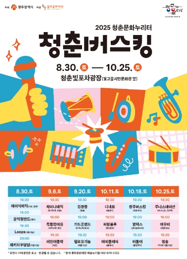 [뉴스노크=김인호 기자] 광주광역시와 광주문화재단은 오는 8월 30일부터 10월 25일까지 매주 토요일 오후 6시 30분, 광주공원 청춘빛포차광장에서 다채로운 공연을 담은 ‘청춘문화누리터 - 청춘버스킹’을 개최한다고 밝혔다.