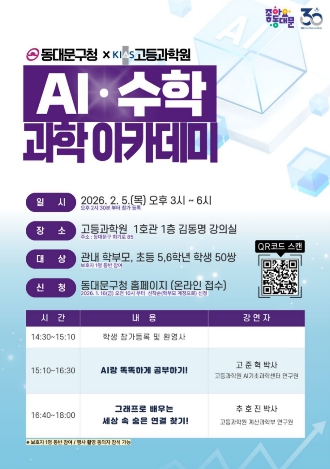 [뉴스노크=김인호 기자] 서울 동대문구가 겨울방학을 맞아 홍릉에 자리한 고등과학원(KIAS)과 손잡고 ‘AI·수학 과학아카데미’를 연다. 아이 혼자 ‘학원’으로 향하는 대신, 부모와 함께 강연장을 찾아 같은 내용을 듣고 집으로 돌아가는 길에 자연스럽게 대화를 이어가게 하는 ‘가족 소통형’ 프로그램이다.