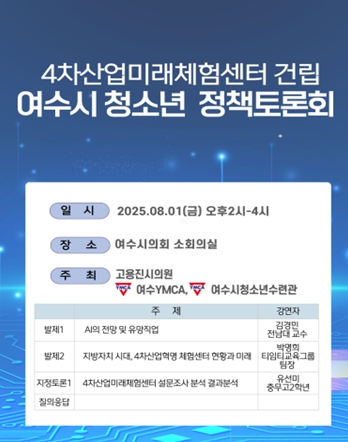 [뉴스노크=김인호 기자] 여수시의회는 8월 1일 여수시의회 소회의실(1층)에서 여수시의회 고용진 의원, 여수YMCA, 여수시청소년수련관과 공동으로 '4차산업미래체험센터 건립을 위한 청소년 정책 토론회'를 개최한다고 밝혔다.