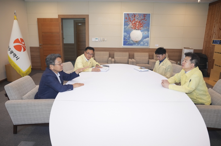 ▲ 강기정 광주광역시장이 지난 7월29일 시청 접견실에서 김용균 행정안전부 안전정책실장과 이선무 중앙합동조사단 광주반장(행안부 농축산해양재난대응과장)을 만나 광주시 피해지역의 신속한 특별재난지역 지정과 국고 지원 필요성을 강조하고 있다./광주광역시 제공 |