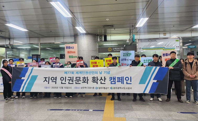 [뉴스노크=김인호 기자] 광주도시공사(사장 김승남)는 지난 10일 서구 상무역에서 광주교통공사와 합동으로 인권문화 존중 캠페인을 펼쳤다고 밝혔다.