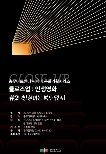 [뉴스노크=김인호 기자] 서울 중구문화재단은 오는 3월 27일, 충무아트센터 씨네마에서 중구민이 직접 ‘나의 인생영화’를 소개하고 영화감독과 함께 대화를 나누는 '클로즈업 : 인생영화'를 개최한다.