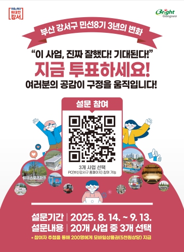 [뉴스노크=김인호 기자] 부산 강서구는 민선8기 3년 동안 추진한 주요 사업 가운데 구민 체감도가 높은 사업 선정을 위해 8월 14일부터 9월 13일까지 설문조사를 진행한다.