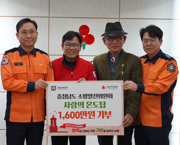 [뉴스노크=김인호 기자] 충청남도 소방발전위원회(소방정책 자문·협의기구)는 지난 30일 연말연시 이웃돕기 성금 모금인 ‘사랑의 온도탑’에 성금 1600만 원을 기탁했다고 1일 밝혔다.